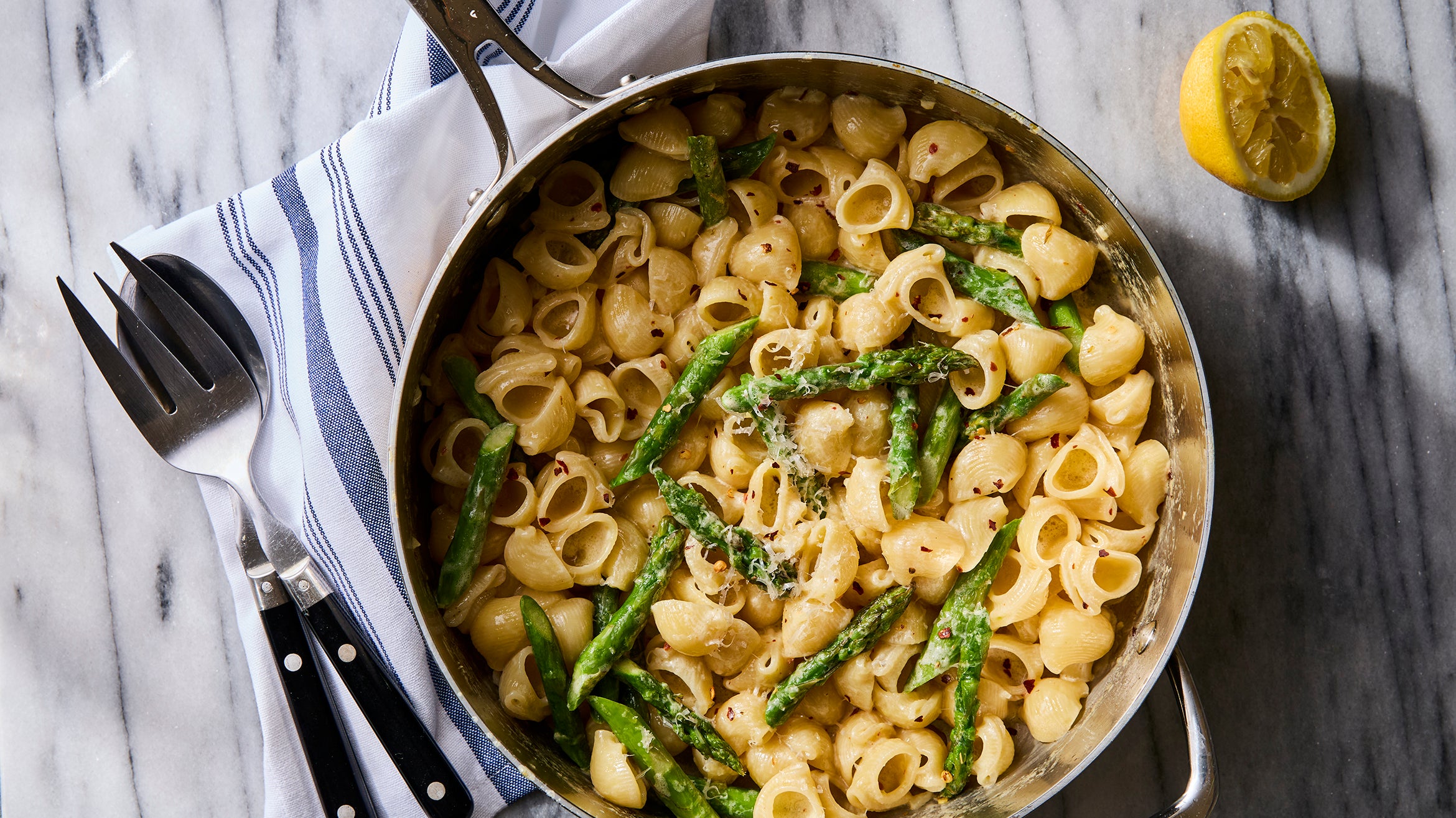 What I love most about this dish is that the sauce comes together in the time it takes to cook the pasta. While the water is coming to a boil, I chop and prepare all my ingredients. Once the pasta goes into the pot, it’s go time: Start by sautéing the asparagus in a bit of olive oil until it’s just tender. (Don’t overdo it, or the stalks can become shriveled and stringy.) When the asparagus is done, remove it to a side plate while you build the sauce by briefly sautéing garlic, lemon zest, and chile flakes in butter until they release their aromas. Stir in a healthy splash of cream and simmer until slightly thickened, then finish off the sauce with a handful of grated Parmesan (or pecorino) cheese and a generous squeeze of fresh lemon juice.